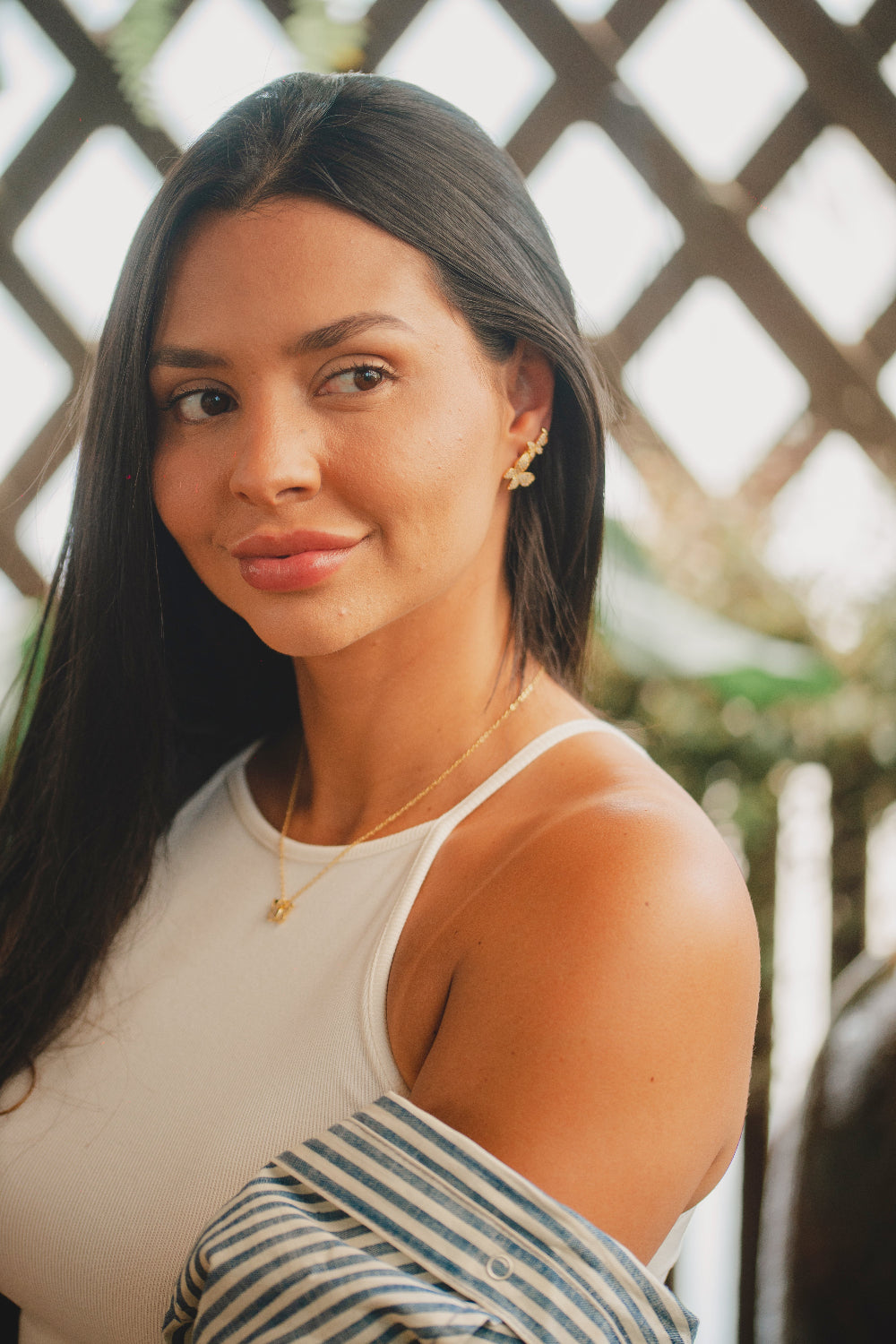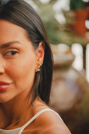 Com design elegante e acabamento luminoso, este brinco traz equilíbrio entre delicadeza e modernidade. Sua tonalidade dourada ilumina o rosto de forma suave, garantindo um charme único.