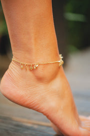 TORNOZELEIRA COM PINGENTE DE CORAÇÃO E SOL FOLHEADO A OURO 18K