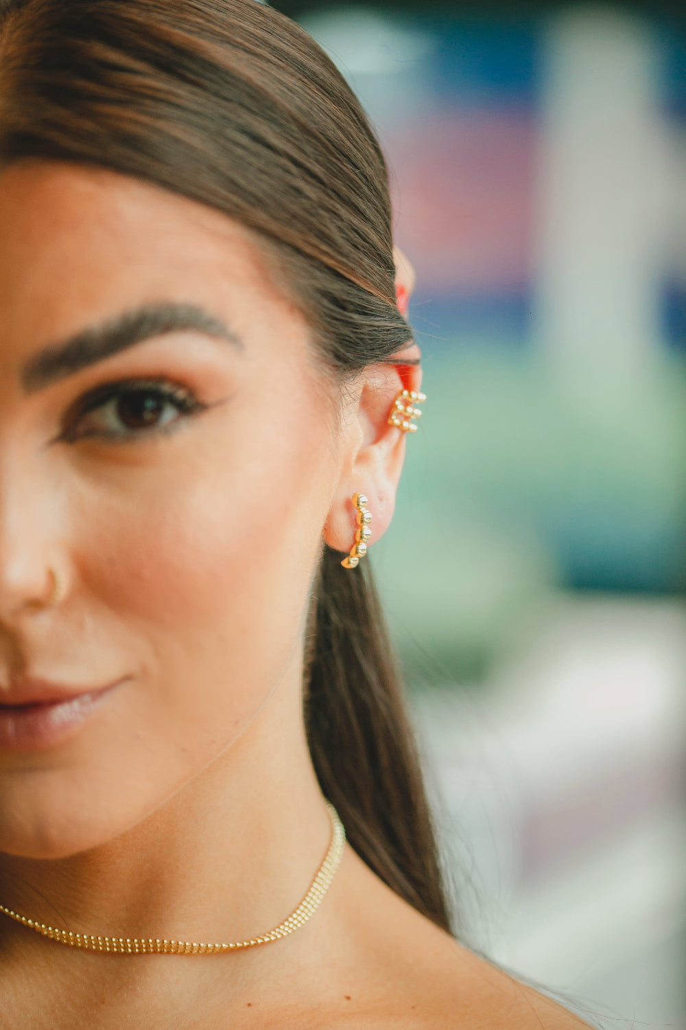 Composto por brincos sutis e um piercing elegante, todos adornados com bolas douradas, esse mix é perfeito para adicionar um toque sofisticado e uniforme ao visual.