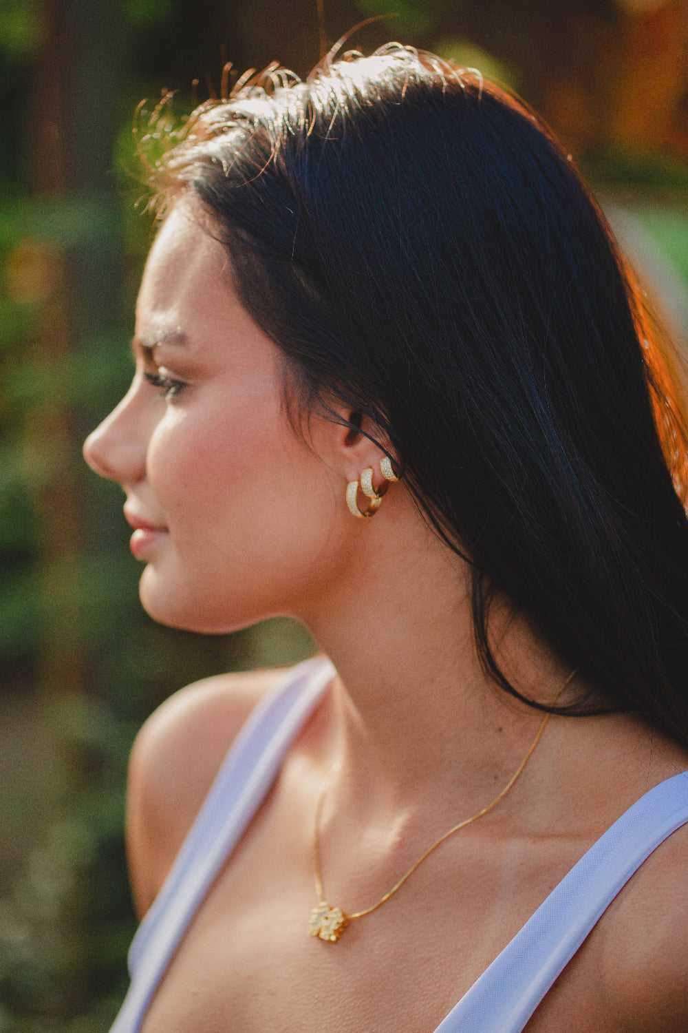 A argola cravejada é perfeita para quem ama acessórios versáteis, que vão do dia a dia a ocasiões especiais. O brilho das pedras adiciona charme e sofisticação, realçando a beleza natural.