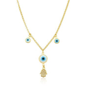 COLAR COM PINGENTE DE OLHO GREGO E MÃO DE HAMSÁ CRAVEJADA DE ZIRCÔNIAS FOLHEADO A OURO 18K